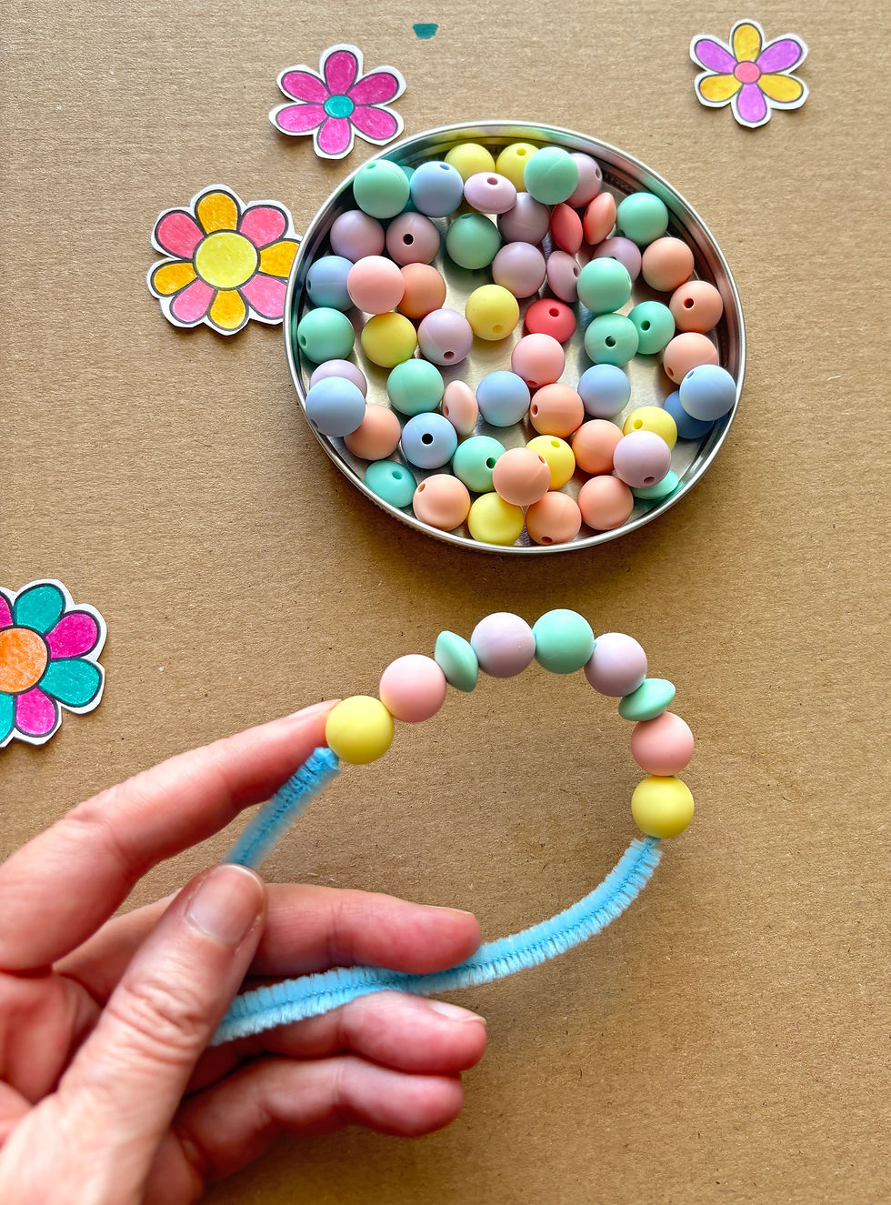Auf den Pfeifenputzer von der Mitte weg die bunten Perlen auffädeln. Damit ihr den Pfeifenputzer in den Becher fädeln könnt, fädelt NICHT bis ganz nach unten.